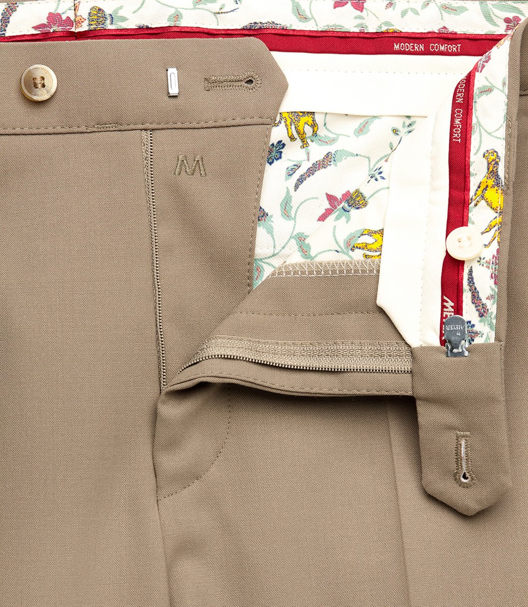 The Meyer Roma style dress slack is a 310g tropical wool mix. This wool blend cloth keeps these trousers lightweight and ensures a cool comfortable feel all year round.