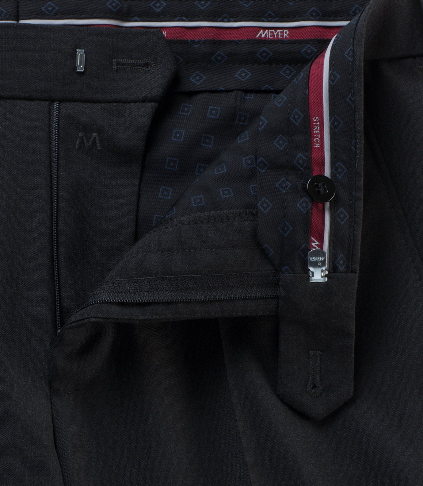 The trousers feature a stretch waistband for a comfortable secure adapative fit, finished with a metal waistband clasp and securing button, and the Meyer security pocket in the left front pocket.